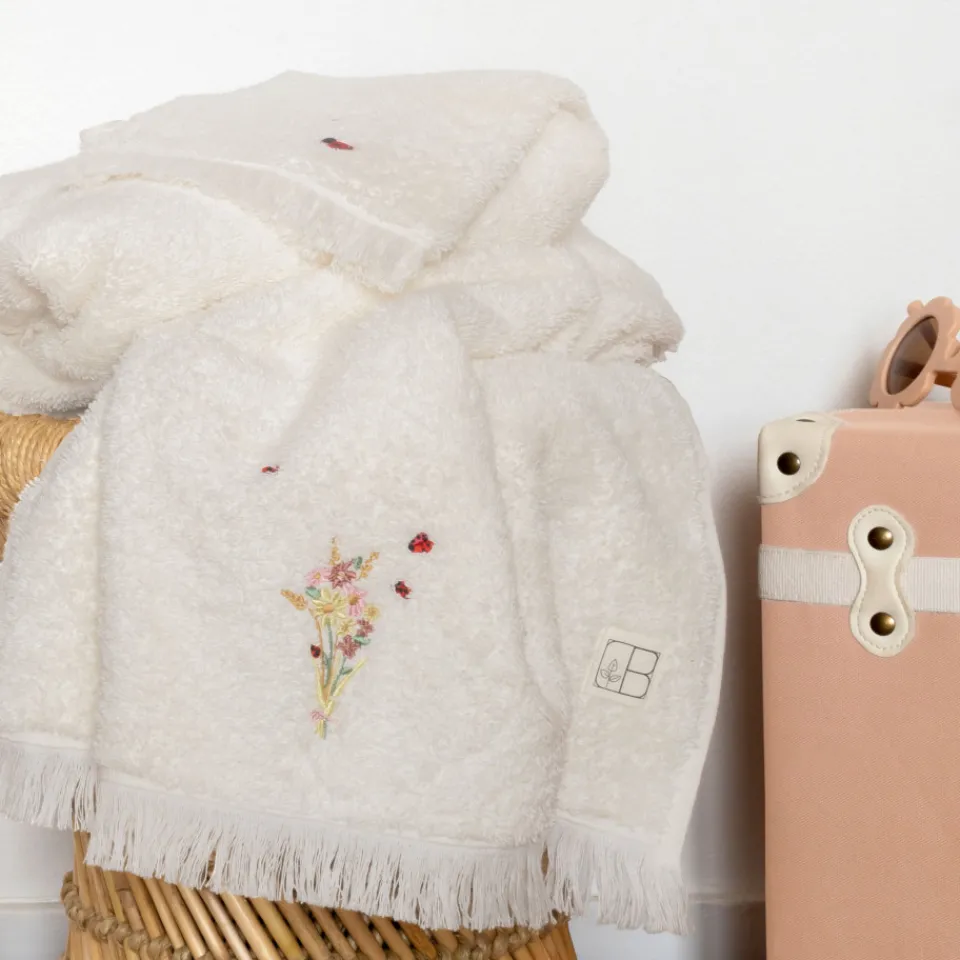 Cette parure de bain en coton bio se distingue par ses finitions frangées tendances.