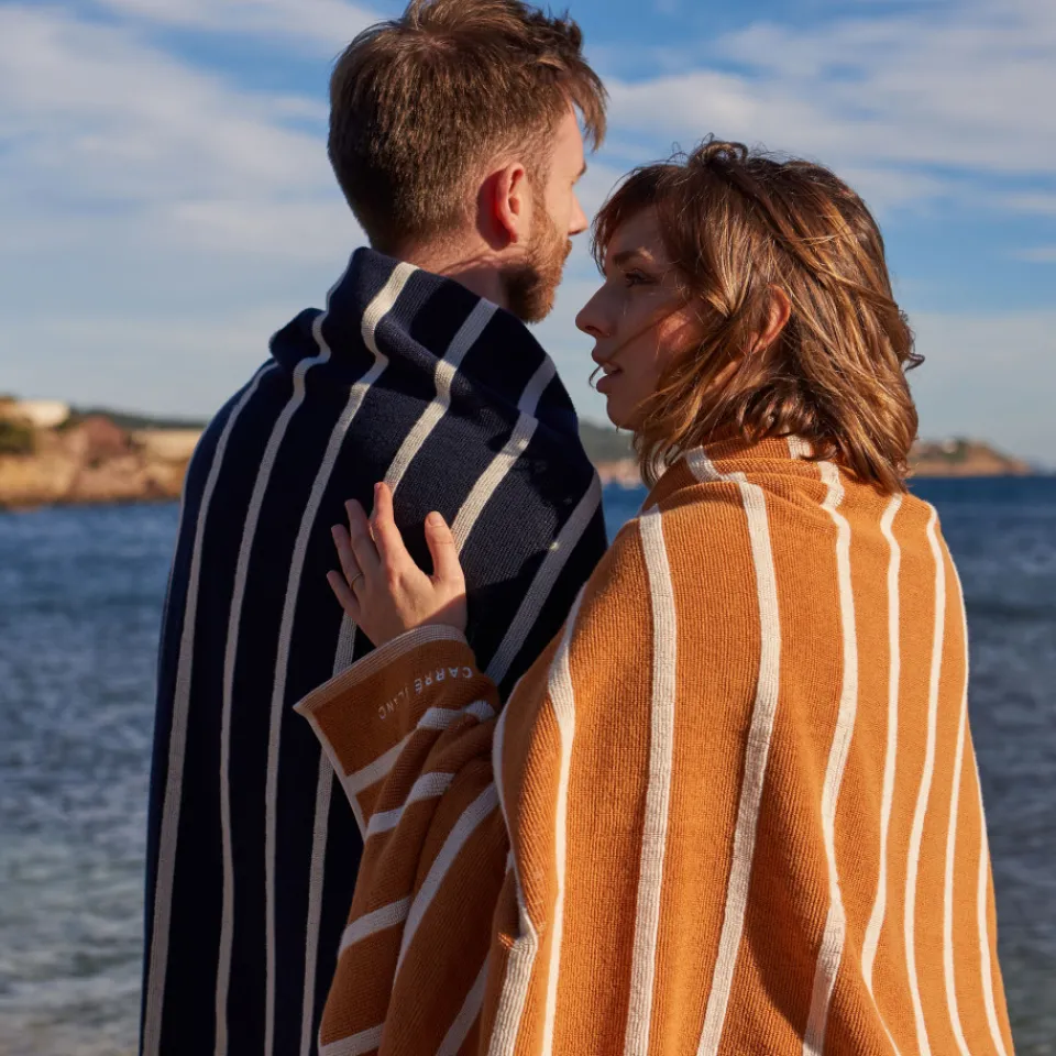 Voyagez instantanément avec le drap de plage Labaule, ses rayures bleues marine ou curcuma évoquant des horizons lointains. Léger et vibrant, il appelle à l’aventure et à la détente, où que vous soyez.