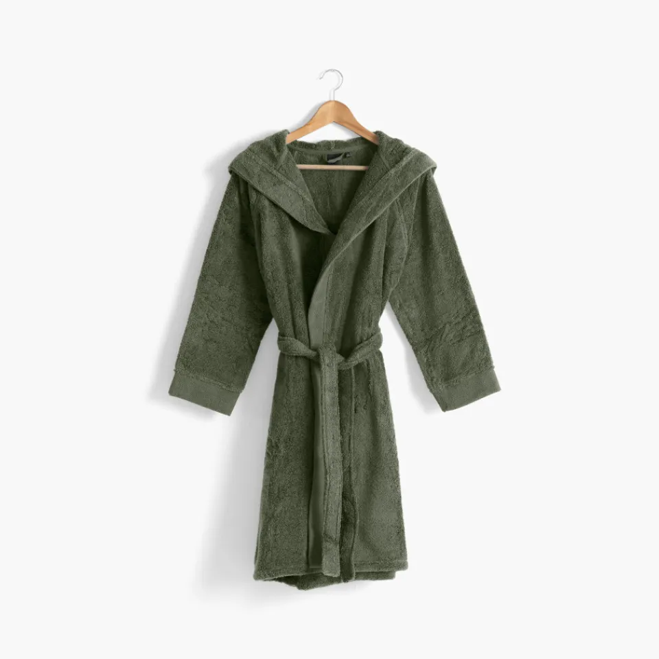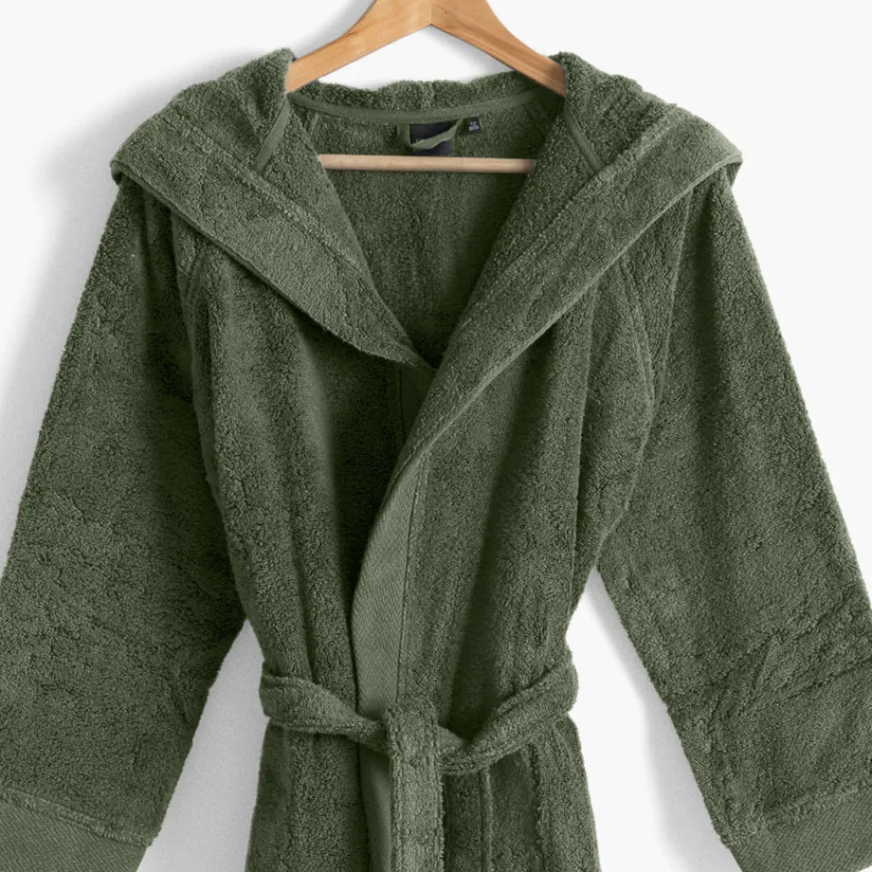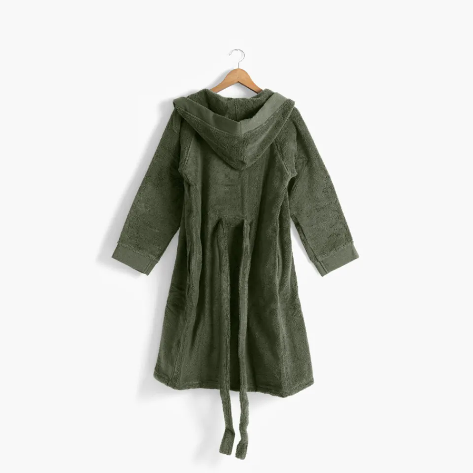 Ce peignoir possède une bande tissée chevron le long de l'encolure et au bas des manches.