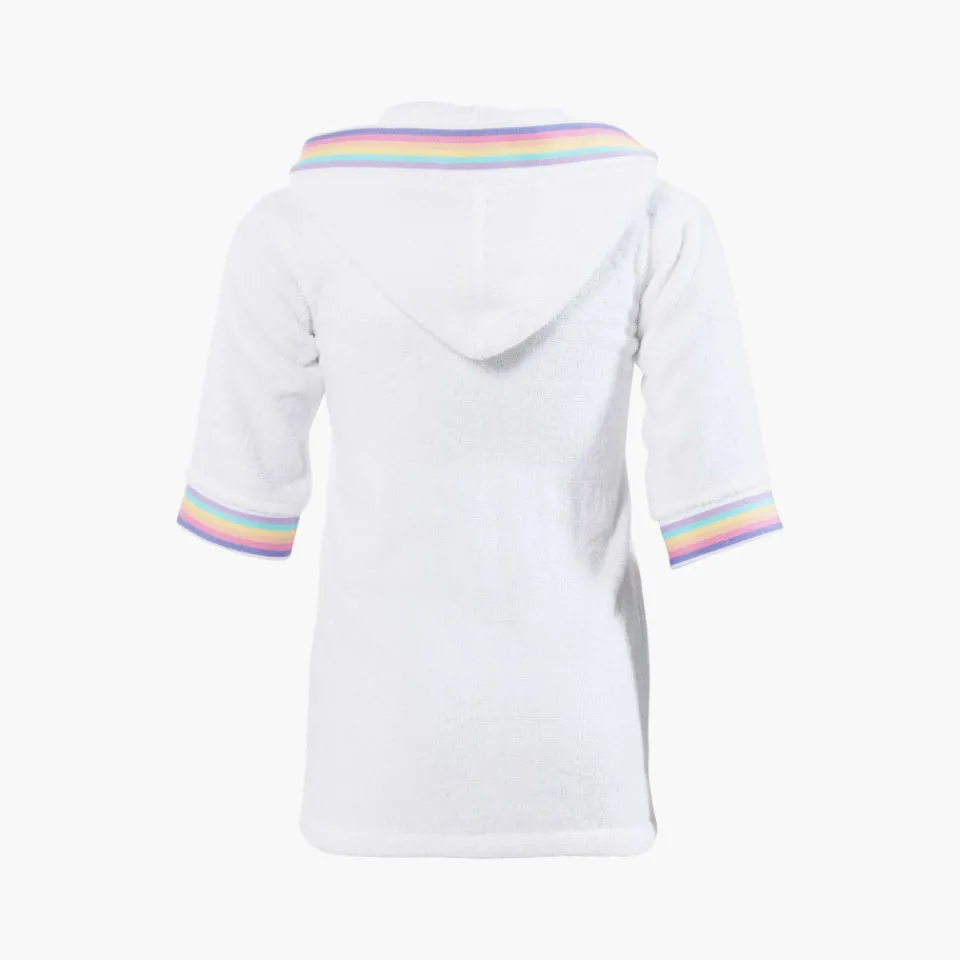 Ce peignoir de bain pour enfant arbore une belle broderie avec des coeurs multicolores.