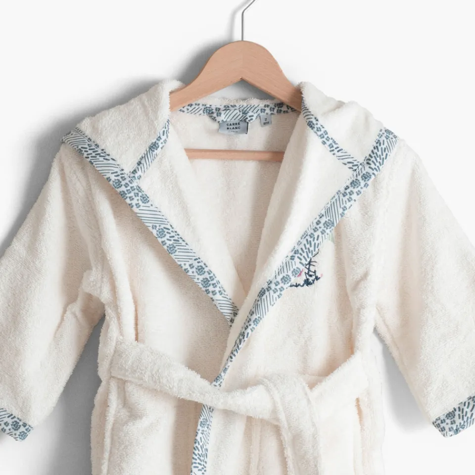 Le peignoir de bain Dandine prend soin des enfants à la sortie du bain grâce à sa composition en coton biologique certifié GOTS. Disponible en coloris ivoire et vert d’eau, cet accessoire de toilette revêt une adorable broderie animalière sur la poitrine et s’accompagne de finitions avec un imprimé graphique le long du col et en bas des manches. Un produit à faire broder pour un cadeau personnalisé !