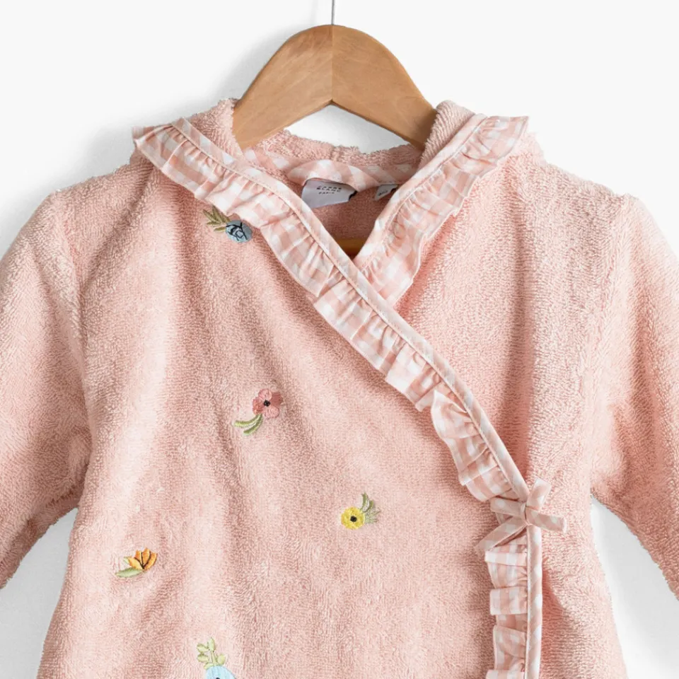 Couvrez d’amour tous les enfants avec le peignoir de bain de la collection Rêve d’or et son adorable coupe cache-cœur. Confectionné en coton biologique, une matière durable et responsable, ce peignoir de bain présente de jolies broderies florales aux couleurs douces et des petits volants au motif vichy couleur dragée. Sans oublier un petit nœud décoratif, un détail 100% girly !