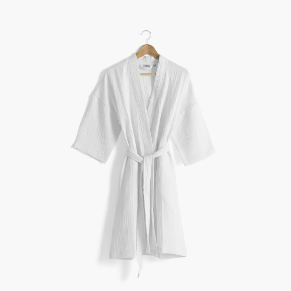 Ce peignoir en gaze de coton bio se décline en coloris naturel, blanc et eucalyptus.