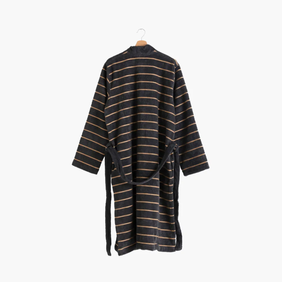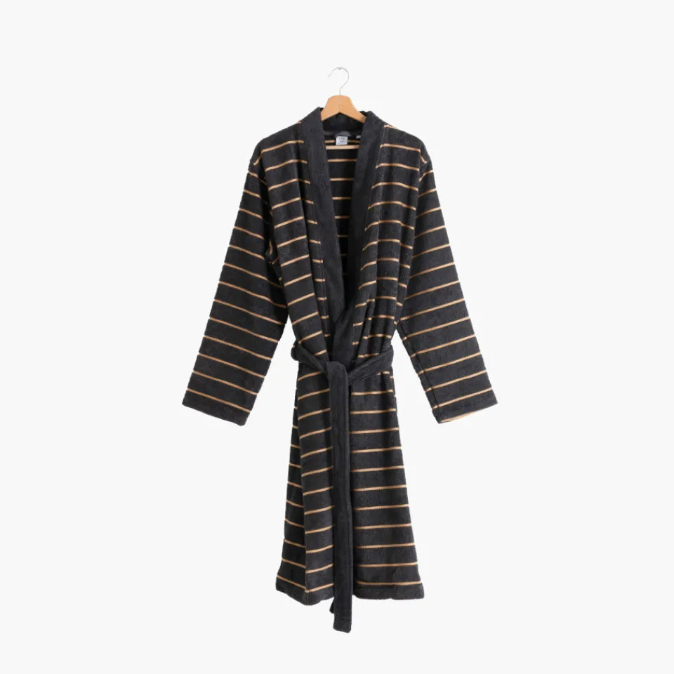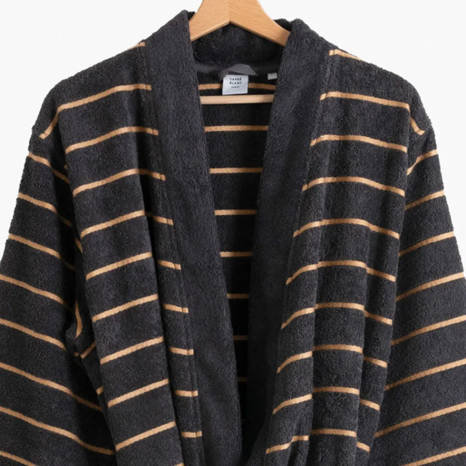 Elégant et moderne, le peignoir de bain Eclipse se distingue par ses fines rayures jacquard. Un modèle pour homme qui joue sur le contraste entre les coloris charbon et caramel.