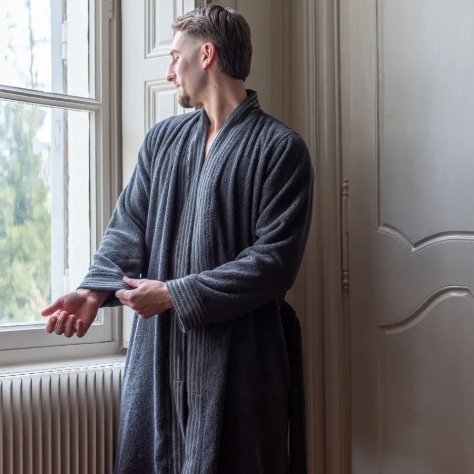Mêlant confort et élégance, ce peignoir avec des poches arbore un élégant coloris poivre. Le liteau jacquard à rayures subtilement contrastées en coloris lin ajoute une note de sophistication à ce modèle pour homme.