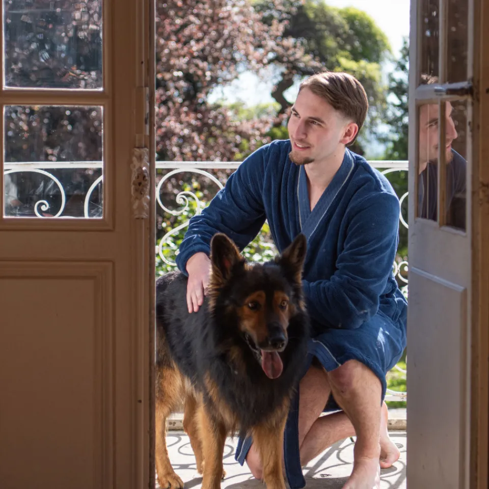 Douce et accueillante, la robe de chambre pour homme Equinoxe revêt un coloris bleu marine et un col kimono moderne. Laissez-vous séduire par ses finitions subtiles le long du col.