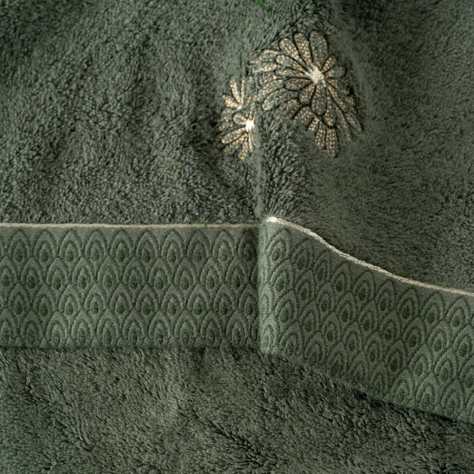 La serviette de toilette Silvalys vous transporte dans une immersion naturelle avec ses deux teintes vert forêt et mousse. Elle est ornée d’une broderie en fil métallique doré.