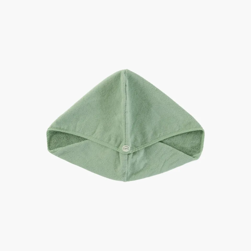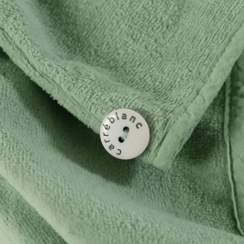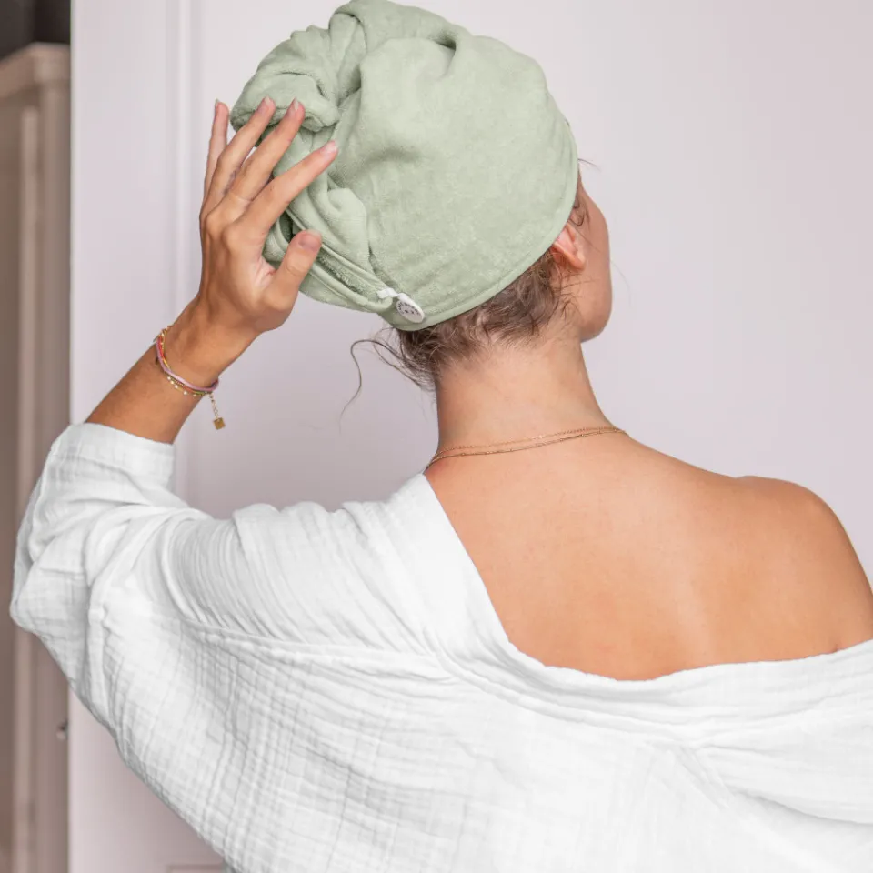Cette serviette pour les cheveux se décline en coloris naturel, blanc et eucalyptus.