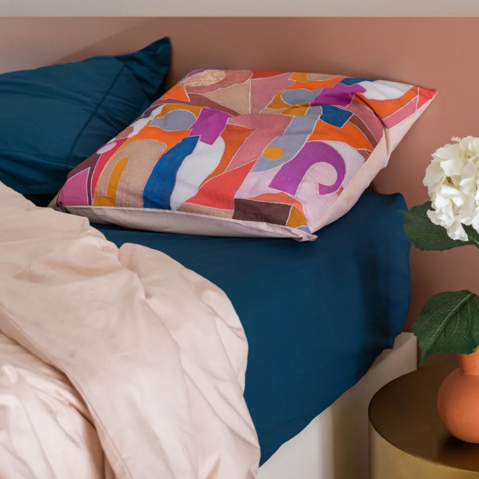 Cette taie d'oreiller au double décor revêt des motifs graphiques et hauts en couleur.