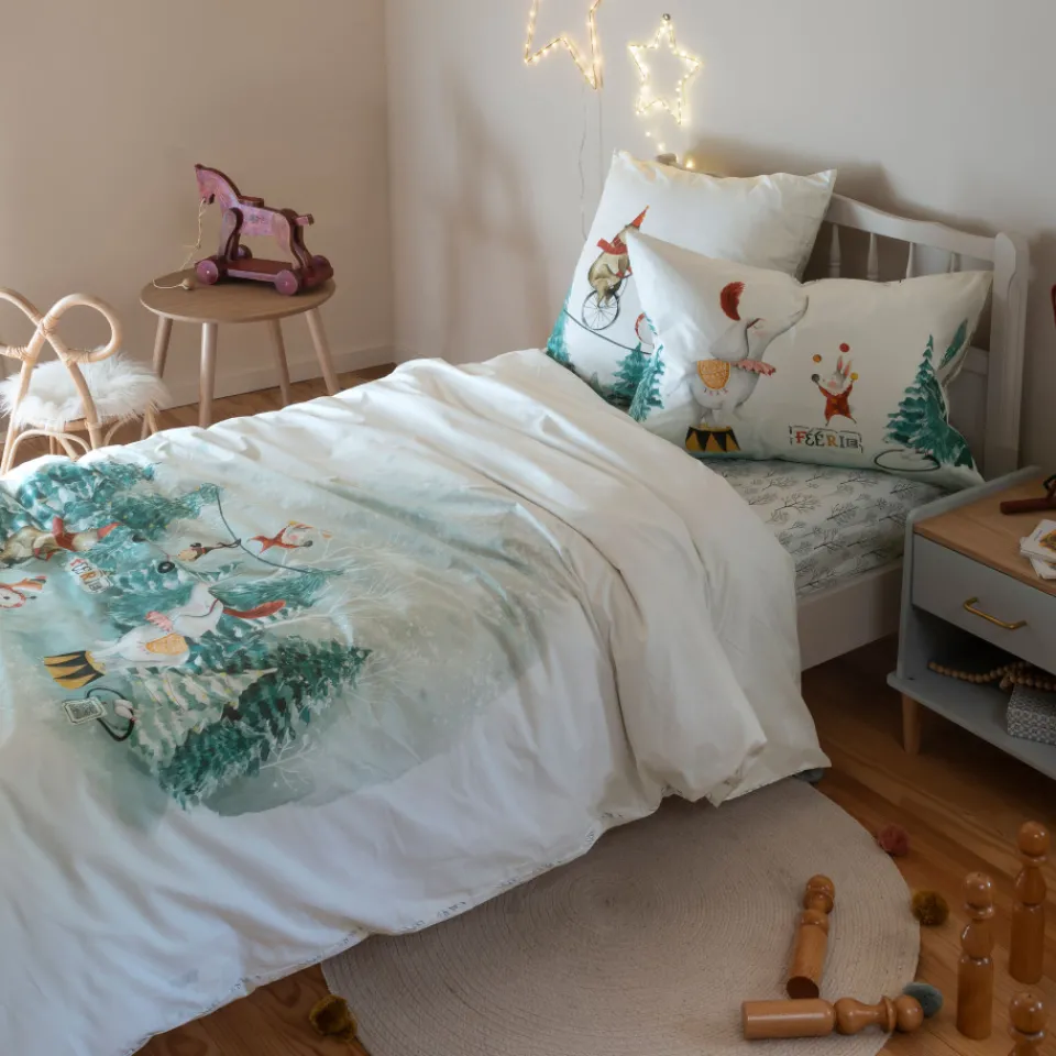 Transformez la chambre de votre enfant en un lieu d’émerveillement avec notre taie d’oreiller Féeries. Ce modèle réversible aux motifs enchanteurs offre un voyage magique vers un cirque d’hiver.