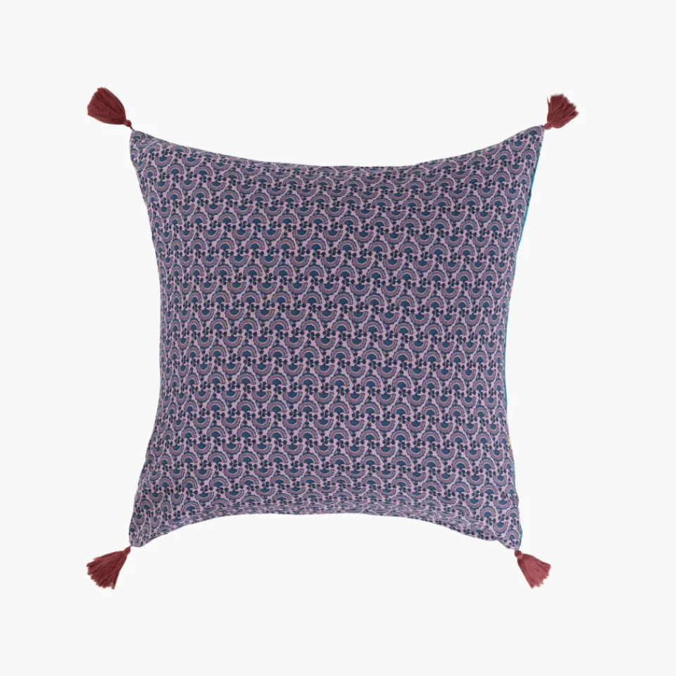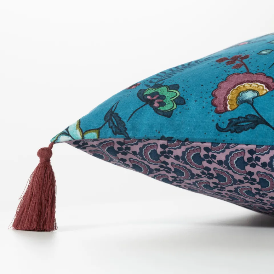 Laissez-vous transporter ailleurs avec la taie d’oreiller carrée Bombay, une collection qui vous fait goûter aux couleurs de l’Inde. Réalisée à partir d’un mélange de lin et de coton, elle revêt un double décor qui offre des fleurs colorées aux effets picturaux d’un côté et un micro-imprimé géométrique de l’autre. La petite touche en plus ? Ses pompons violets qui habillent la taie d’oreiller !