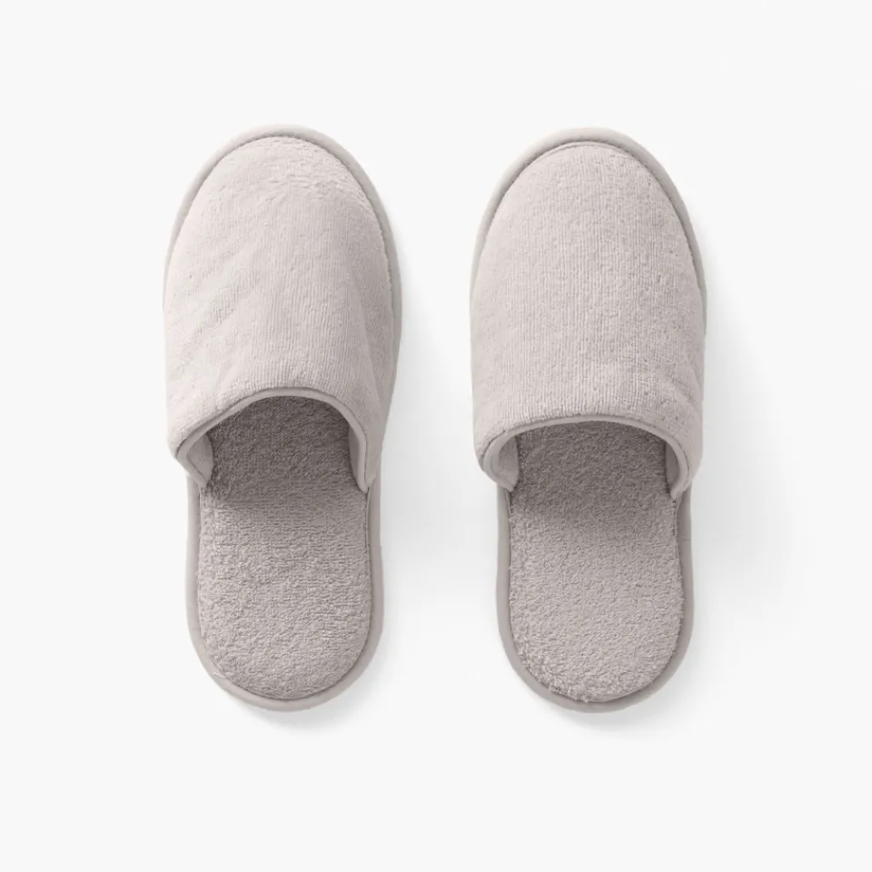 Paire de chaussons mules femme. Taille unique. Vos pieds vont adorer le confort de nos chaussons 100% coton. A la sortie du lit ou après la douche, nos mules vous accompagnent dans vos moments cocooning. Craquez pour son coloris perle, sobre et intemporel.