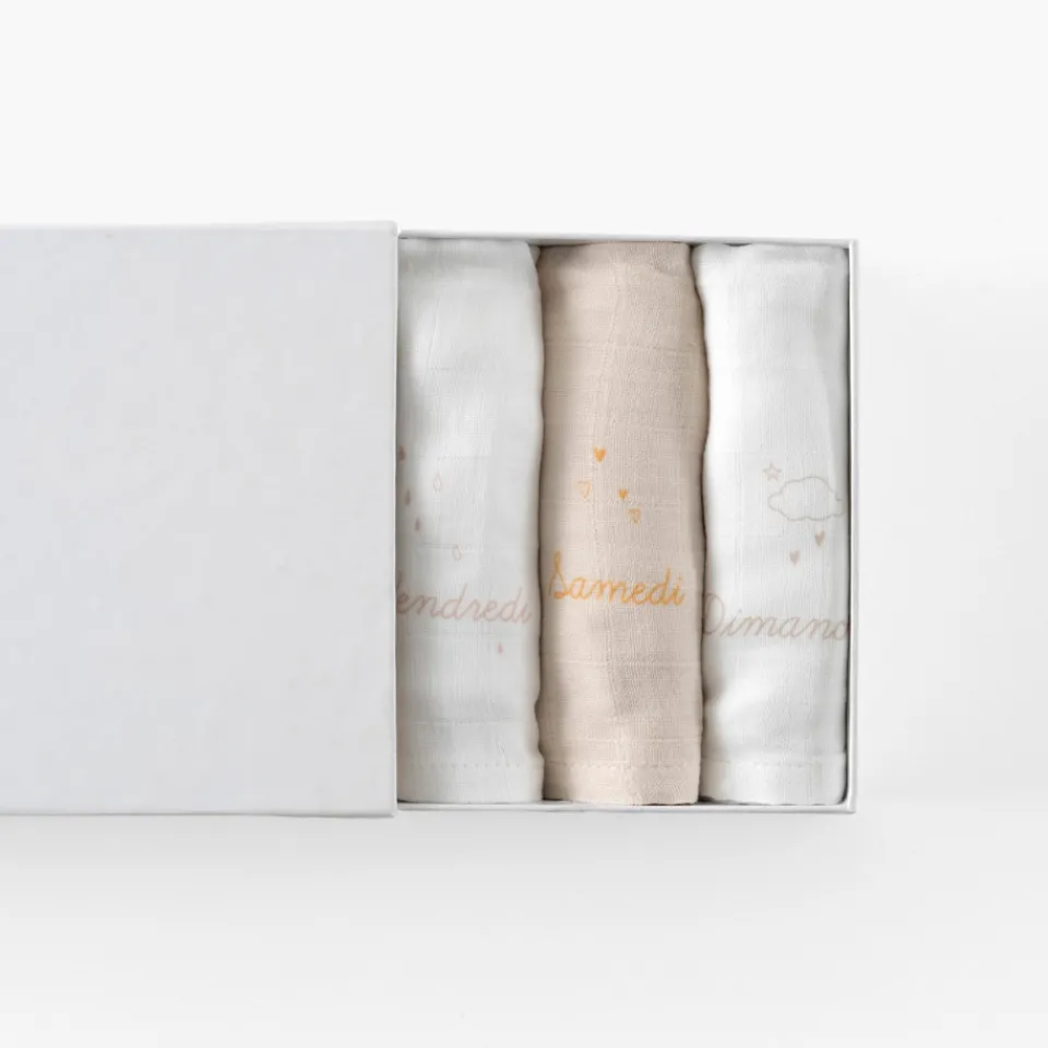 Optez pour le semainier de langes Bienvenue pour célébrer chaque jour avec l’arrivée de bébé. À l’intérieur, vous trouverez 4 langes blancs et 3 langes naturels, le tout soigneusement emballé dans une boîte à tiroirs.