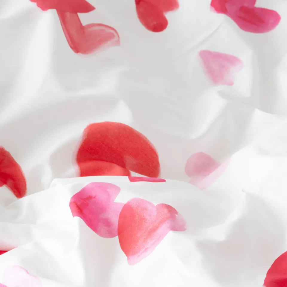 Transformez votre chambre en havre de douceur avec la housse de couette réversible Adore en percale de coton. Vous retrouverez des motifs cœurs et une inscription « Douce nuit » pour des rêves élégants.