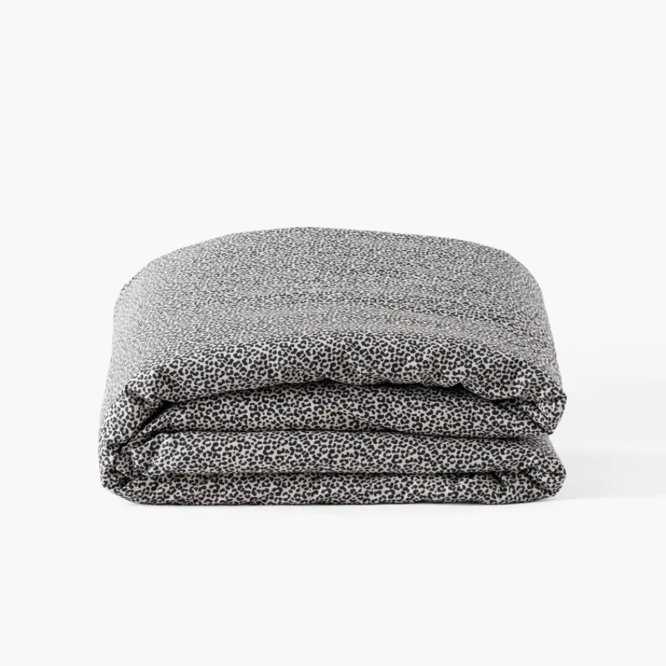 La housse de couette Ysée en coton bio combine un maxi motif de jungle graphique avec un imprimé animalier, créant un effet visuel unique et captivant. Découvrez des motifs léopard, zèbre et tigre cachés.utre.