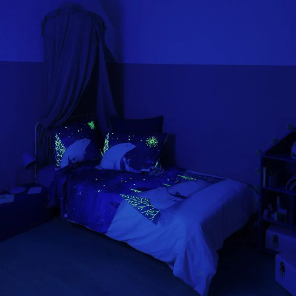 Plongez dans cette magnifique fresque hivernale phosphorescente avec la housse de couette Stellaire. La magie de Noël s’installe dans la chambre de votre enfant pour des nuits enneigées et magiques.