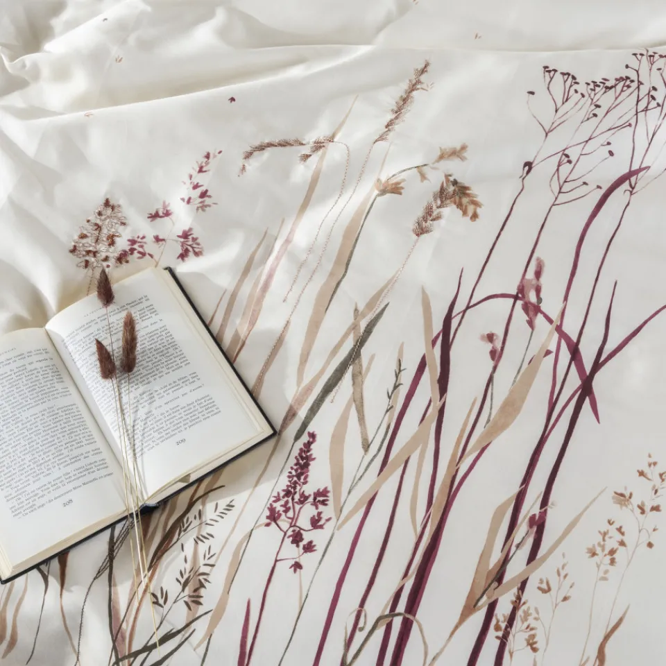 La housse de couette Aura exprime un savoir-faire d’exception. Admirez le mariage d’un dessin aquarellé imprimé et de délicates broderies aux points travaillés, utilisant des fils satinés et métalliques.
