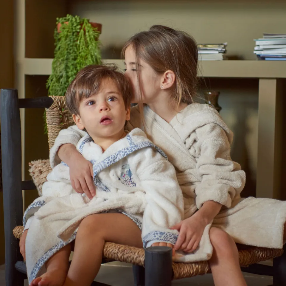 Le peignoir de bain Dandine prend soin des enfants à la sortie du bain grâce à sa composition en coton biologique certifié GOTS. Disponible en coloris ivoire et vert d’eau, cet accessoire de toilette revêt une adorable broderie animalière sur la poitrine et s’accompagne de finitions avec un imprimé graphique le long du col et en bas des manches. Un produit à faire broder pour un cadeau personnalisé !