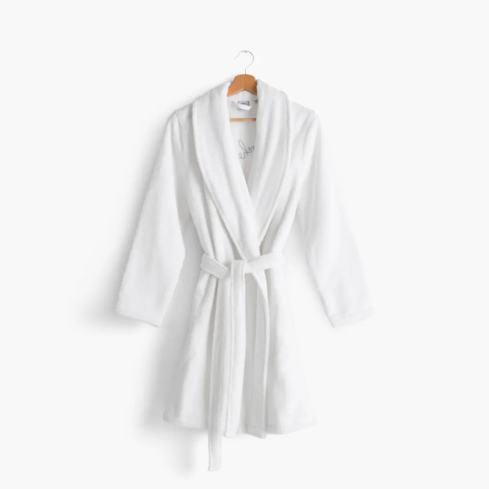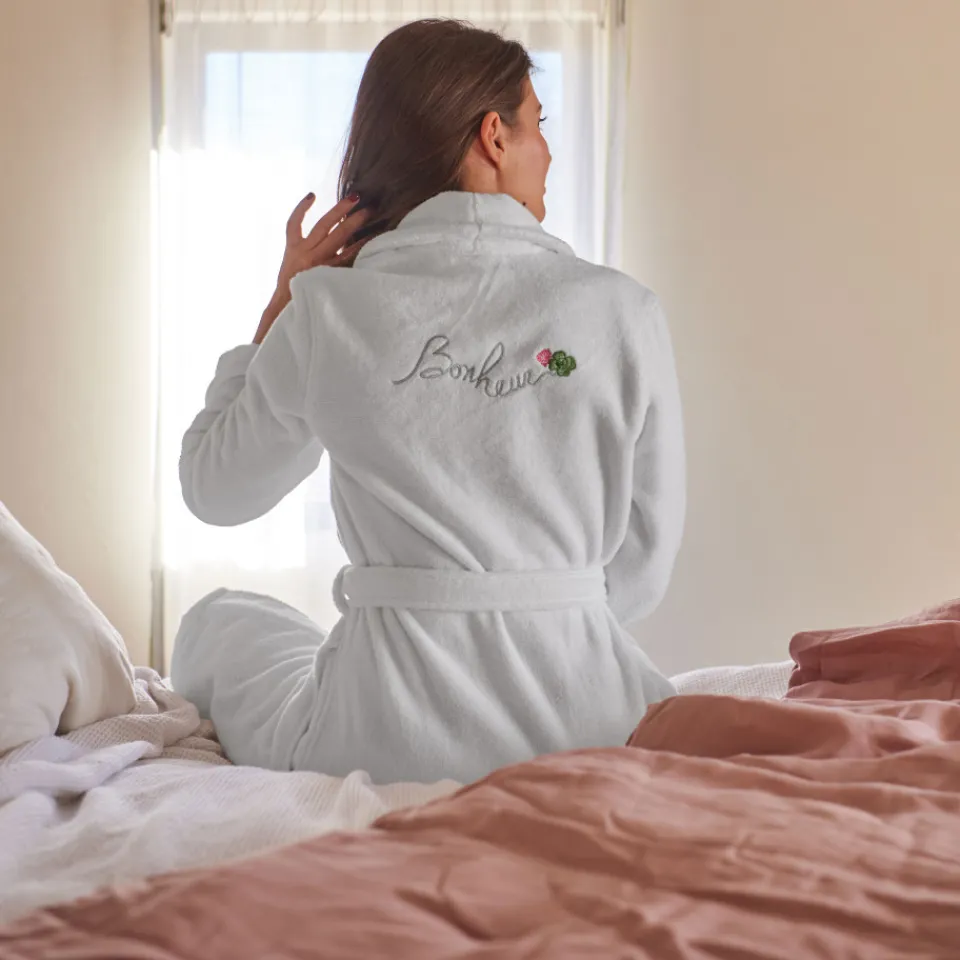 Laissez-vous séduire par l’esprit chic et français du peignoir de bain Eloges. Confectionné en coton moelleux, cet accessoire au style très féminin présente une broderie en fil argenté « bonheur » accompagnée d’un trèfle à quatre feuilles porte-bonheur. Il possède également des poches intérieures et une ceinture sous passants pour vous envelopper de douceur. Un peignoir idéal pour la saison printemps-été !