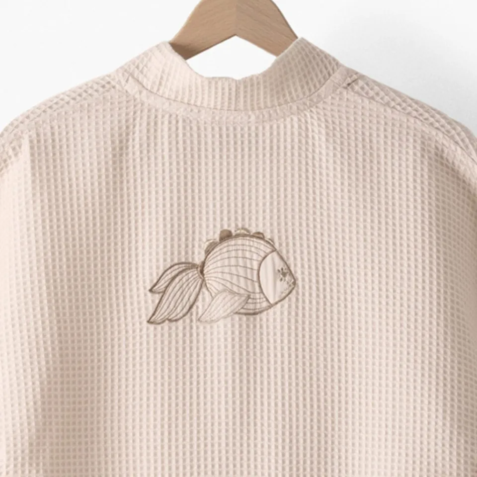 Découvrez le peignoir de bain Amorgos. Sa texture légère en 100 % coton offre douceur, tandis que sa broderie au dos apporte élégance et sophistication à vos rituels de bain.