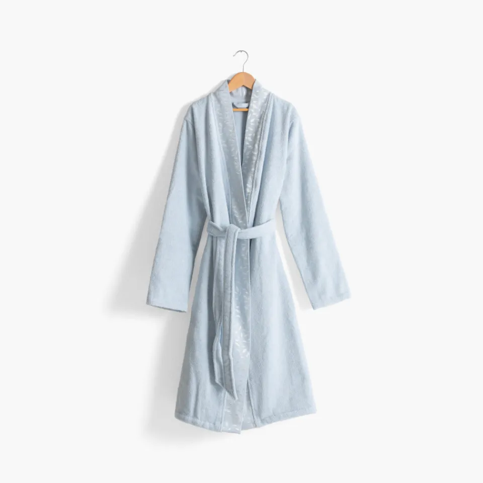Confectionné en bouclette de coton moelleux, le peignoir de bain Equinoxe revêt un coloris bleu givre et un col kimono moderne. Laissez-vous séduire par ses finitions subtiles et raffinées.