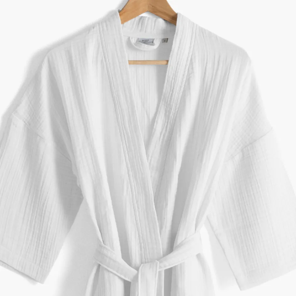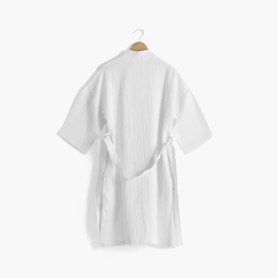 Ce peignoir en gaze de coton bio se décline en coloris naturel, blanc et eucalyptus.