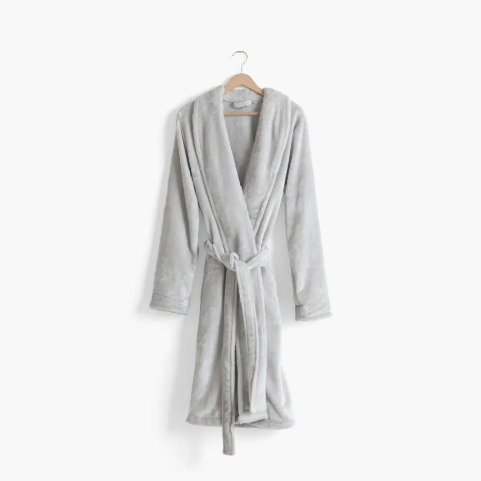 Douce et accueillante, la robe de chambre pour femme Equinoxe revêt un coloris tourterelle et un col châle enveloppant. Laissez-vous séduire par ses motifs de feuilles délicatement brodés.