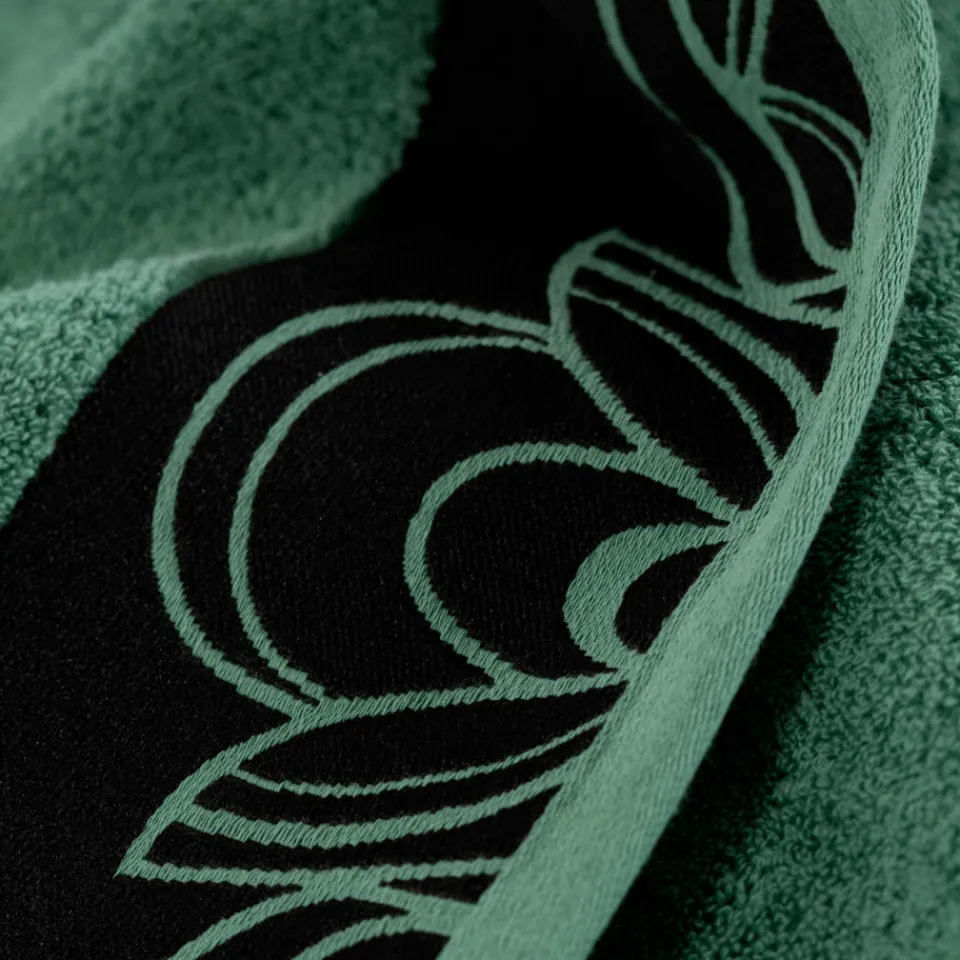 Ce linge de bain revêt des motifs jacquard sur le liteau qui rappellent les mosaïques.