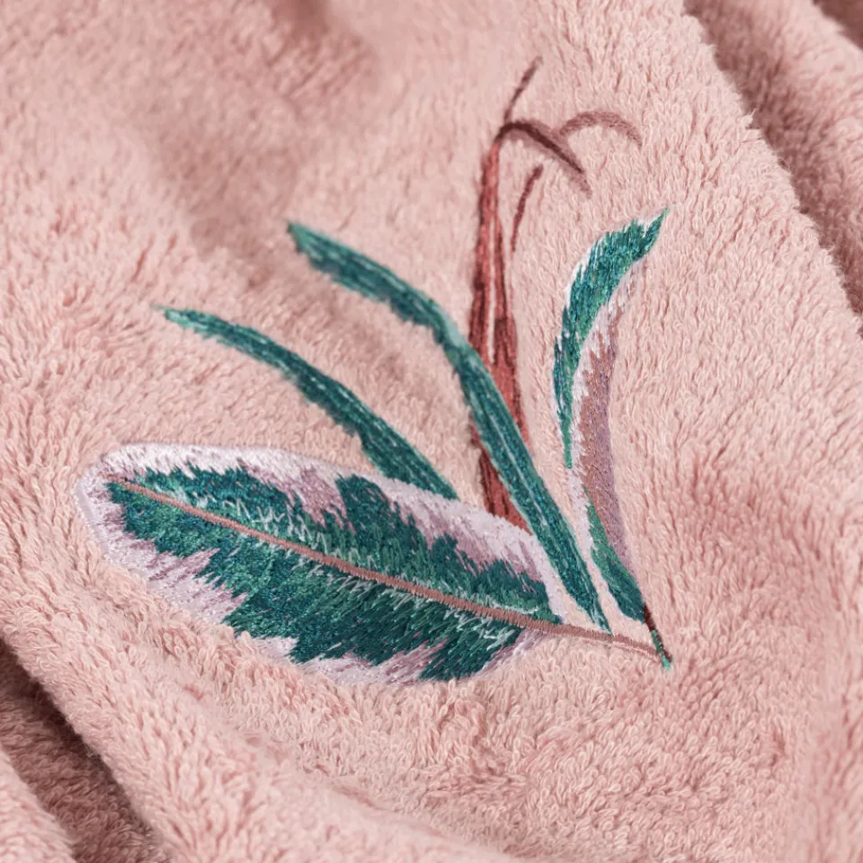 Un linge de bain qui vous séduira par ses broderies de calathéas fines et élégantes.