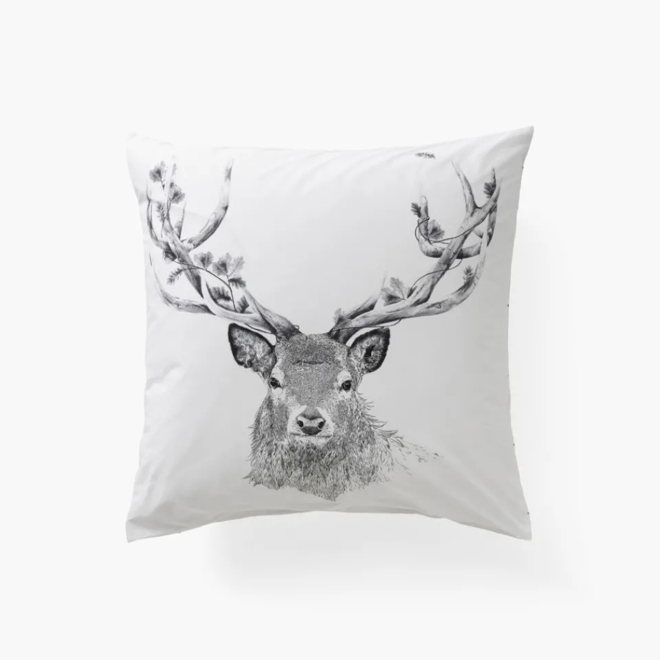 Cette parure de lit se distingue par son motif grandeur nature de cerf majestueux.