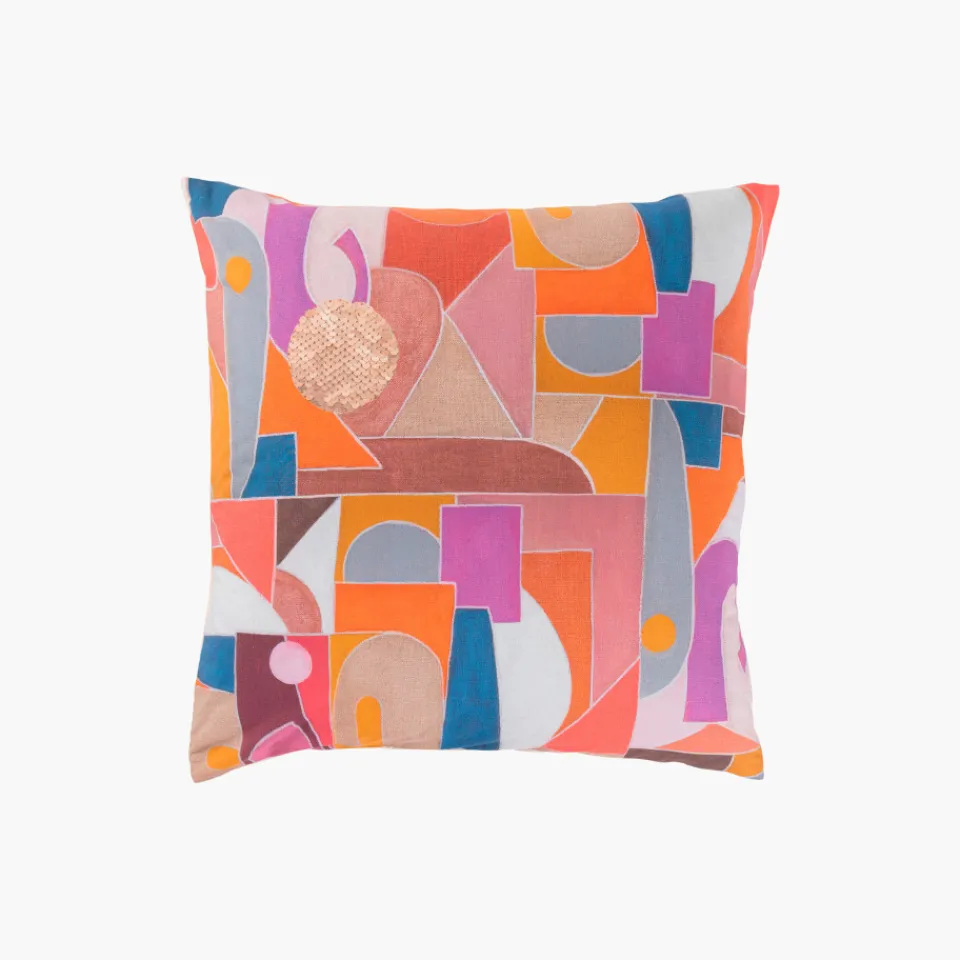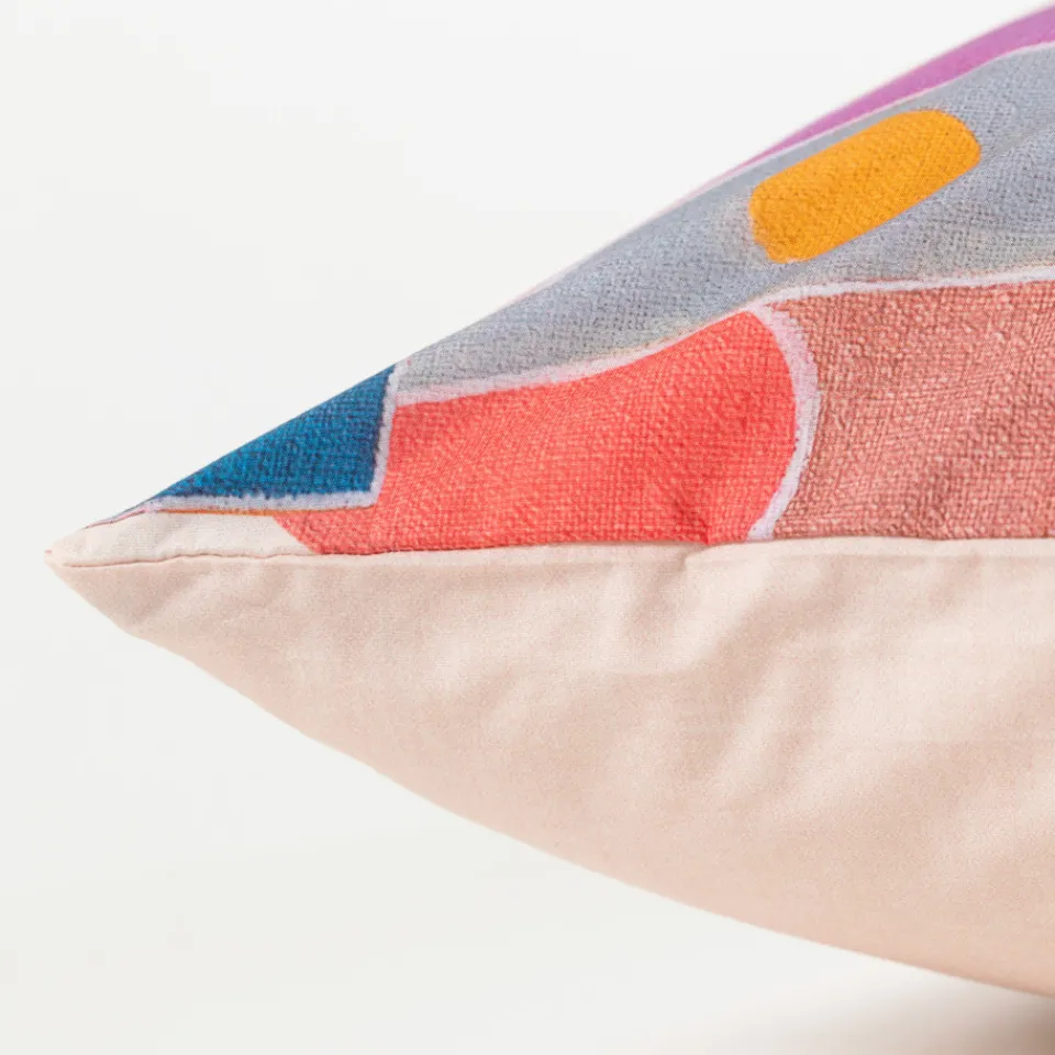 Cette taie d'oreiller au double décor revêt des motifs graphiques et hauts en couleur.