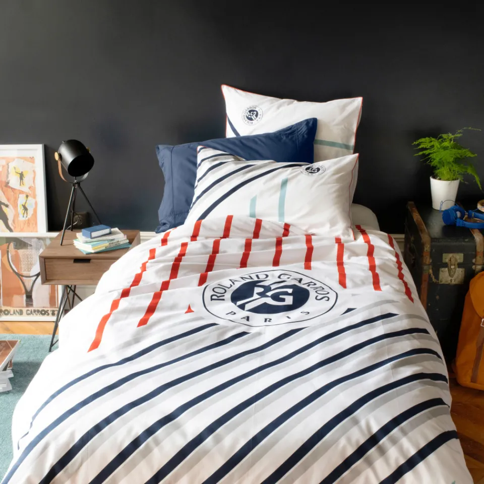Ce linge de lit affiche une combinaison de lignes graphiques aux couleurs du tournoi.